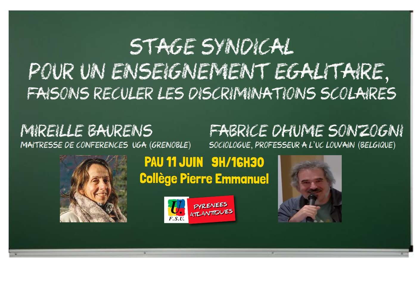 Pour mieux identifier les mécanismes de reproduction de ces discriminations et tenter de les résorber, les sections départementales FSU 64 et FSU 65 organisent un stage syndical intitulé « Pour un enseignement égalitaire : faisons reculer les discriminations scolaires » le 11 juin 2026, dans les locaux du collège Pierre Emmanuel (25, avenue BARADAT à PAU).