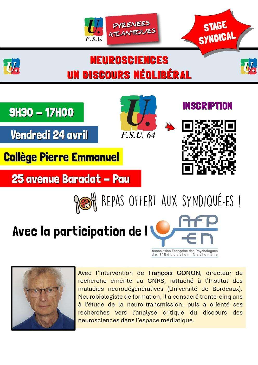LE 24 AVRIL prochain, à PAU, dans les locaux du collège Pierre Emmanuel (25, avenue Honoré Baradat), la FSU-SNUipp 64 organise une journée rencontre avec François GONON.