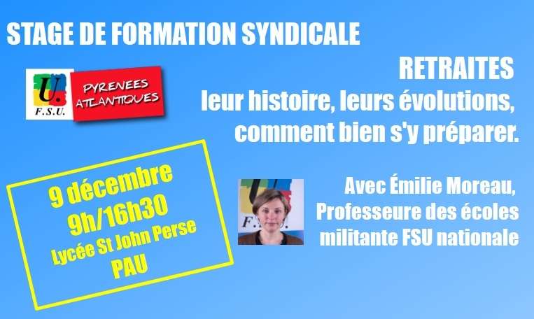 STAGE SYNDICAL RETRAITES : leur histoire, leurs évolutions, bien s'y préparer. Mardi 9 décembre à PAU, 9h/16h30 La FSU 64 organise un stage de formation syndicale sur le thème des RETRAITES. Ce stage est ouvert à toutes et tous. Conformément à la réglementation, ce stage de formation est de droit. Notre intervenante Émilie Moreau, professeure des écoles, syndicaliste et responsable nationale de la FSU. Programme de la journée : [...]